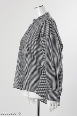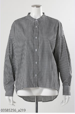 シワになりにくい綿ポリ素材。バックスタイルにギャザーを施した、シンプルながらおしゃれに決まるシャツブラウス。後ろ下がりのデザインでヒップ周りもカバー出来る、羽織にも便利な一枚です。