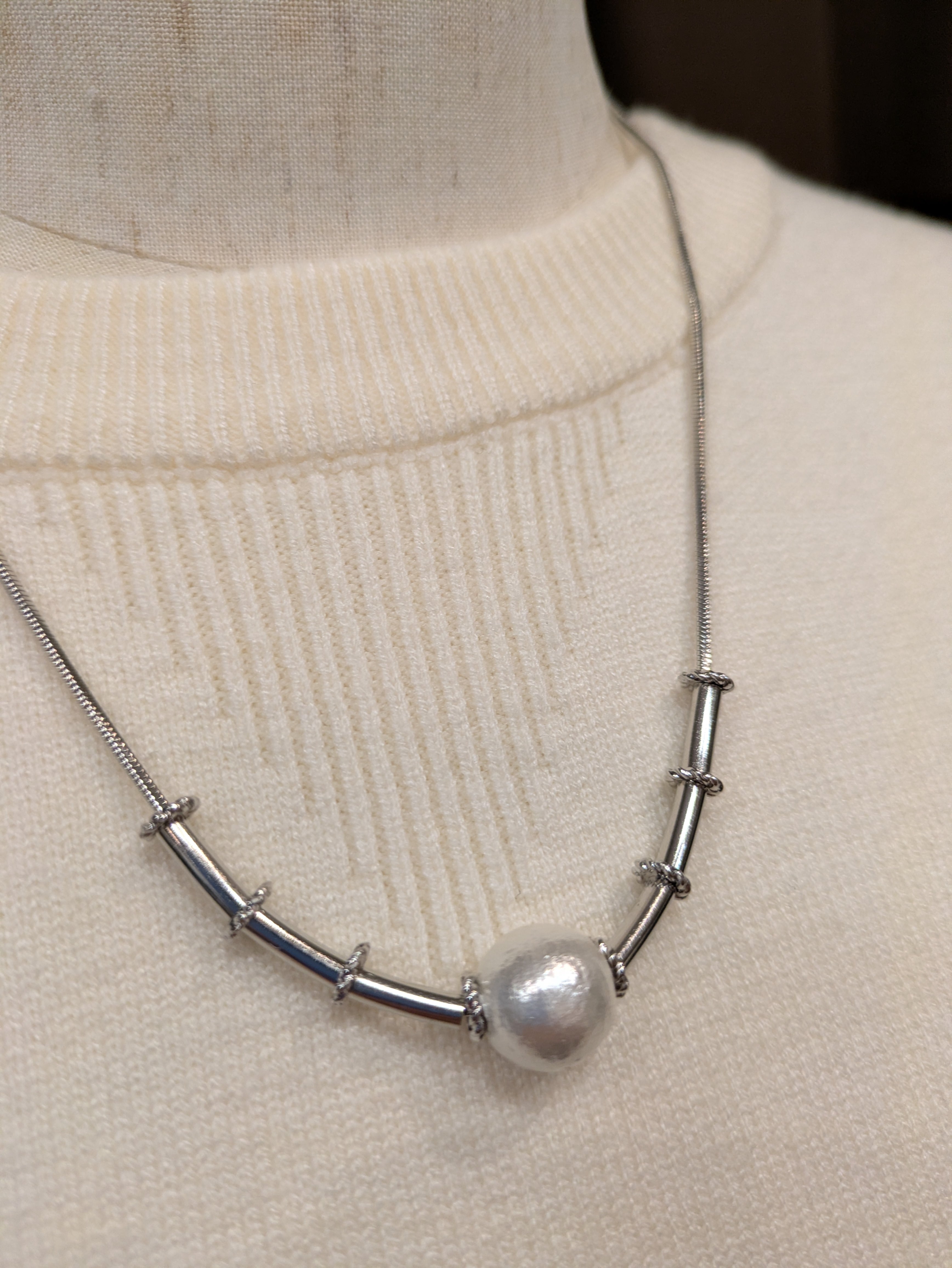 コットンパールとマカロニパーツが3連になったネックレス