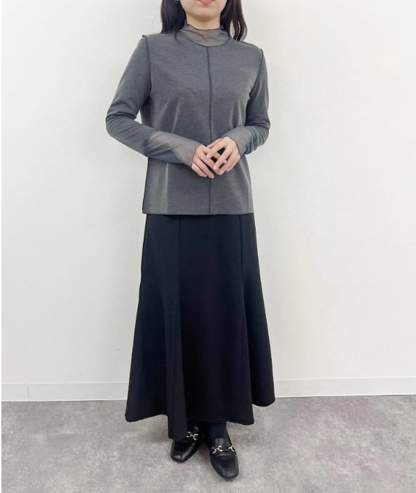 ②なめらかな手触りが魅力のハイネックトップス。衿元と袖をシアー素材で切り替えることで、ハイネックでも重たく見えず軽やかな印象に仕上げています。